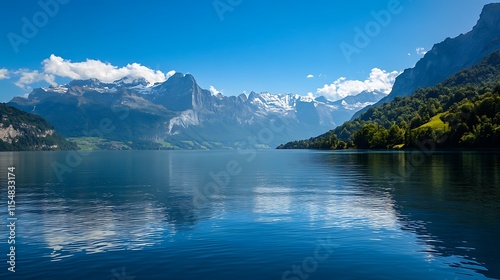 Naklejka premium Serene Swiss Lake with Majestic Mountains. Tranquil Alpine Landscape.