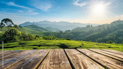 Fototapeta premium Serene Tea Plantation View from a Rustic Wooden Table