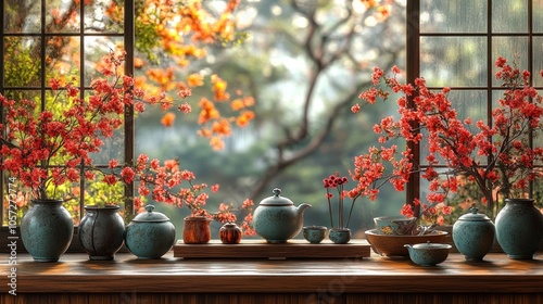 © Moza, Fototapeta premium Serene tea setup with blooming flowers by a window.