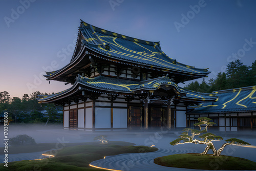 © Pichetpong, Fototapeta premium Serene Temple at Dawn: A majestic temple, bathed in the soft hues of dawn, stands amidst a serene landscape, offering a glimpse into timeless beauty and tranquility.