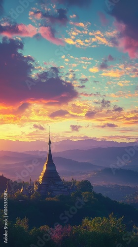 © Kitta Studio, Obraz premium Serene Temple at Sunrise in Tranquil Landscape