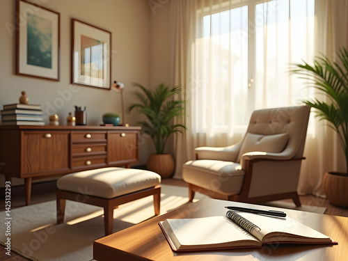 Fototapeta premium Serene Therapy Space, A Warmly Lit Office Interior with Plush Rug, Comfortable Seating, and Natural Light for Consultation and Reflection