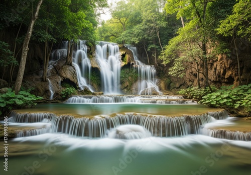 Obraz premium Serene tiered waterfall cascading through lush green tropical forest with...