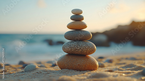 Fototapeta premium serene top view of a zen stone pyramid on a sandy beach, evoking balance,...