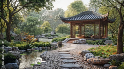 Obraz premium Serene Traditional Asian Garden with Pagoda, Lush Greenery, and Tranquil Pond in Morning Light