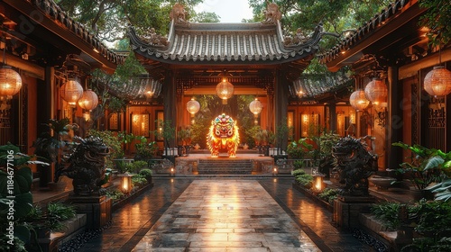 Fototapeta premium Serene Traditional Courtyard with Illuminated Lion Dance Statue