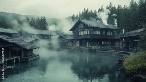 © Sevinj , Fototapeta premium Serene Traditional Japanese Hot Spring Resort in the Forest. AI generated illustration