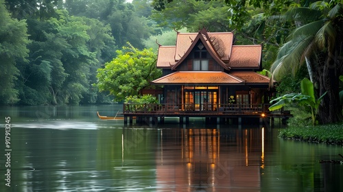 © Thares2020, Obraz premium Serene Traditional Thai House Nestled by Tranquil River and Lush Greenery