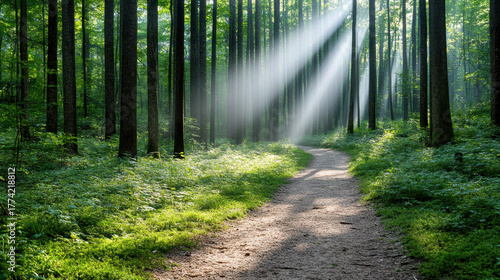 © siraphol, Obraz premium Serene trail winds through lush forest, illuminated by soft beams of light filtering through