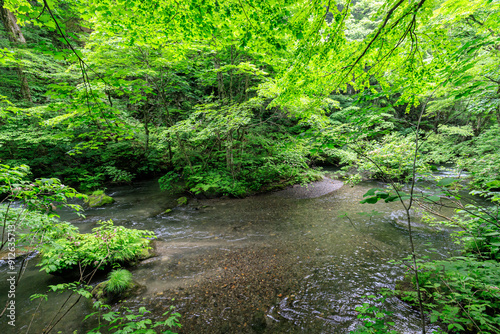 Fototapeta premium Serene Tranquility: A Glimpse into the Emerald Heart of Oirase River, Aomori,...
