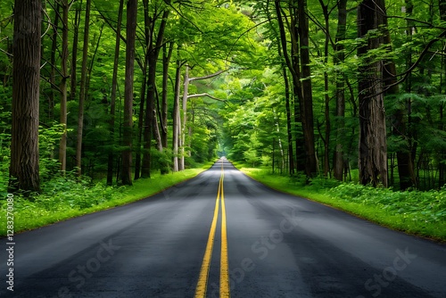 © Pattra, Fototapeta premium Serene Tree-Lined Pathway Through Vibrant Green Forest Landscape