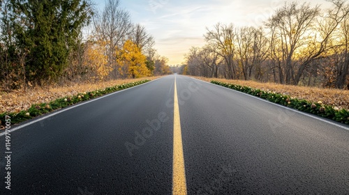 © Sangsung, Fototapeta premium Serene Tree-Lined Road Leading into Sunset Horizon