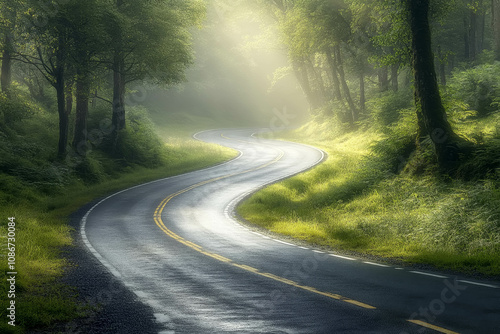 © Aleksej, Obraz premium Serene Tree-Lined Road Surrounded by Lush Greenery with a Carpet of Fallen Leaves