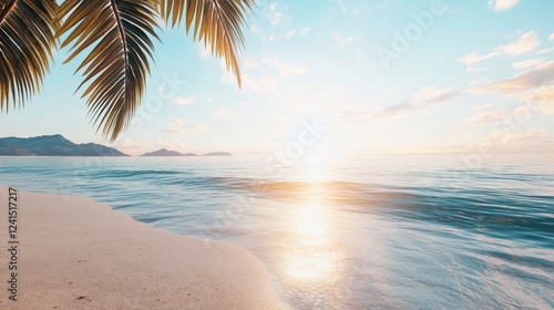 Fototapeta premium Serene Tropical Beach at Sunrise with Palm Leaves and Gentle Waves