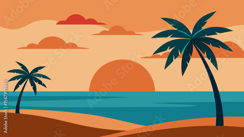 Obraz premium Serene Tropical Beach Palm Trees Ocean Vector Illustration