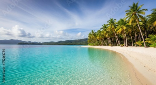 © Mochammad, Fototapeta premium Serene Tropical Beach Paradise with Palm Trees.