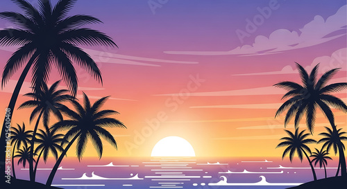 © Tomas, Obraz premium Serene tropical beach paradise with silhouetted palm trees against a vibrant ocean sunset vector illustration