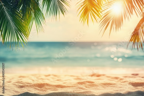 Fototapeta premium Serene tropical beach scene at sunset, palm leaves framing the ocean view.