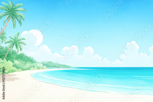 © Watercolor_Kawaii, Fototapeta premium serene tropical beach scene featuring palm trees, soft sand, and calm turquoise waters under clear blue sky. peaceful atmosphere invites relaxation and tranquility