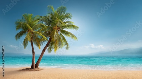 Obraz premium Serene Tropical Beach Scene with Palm Trees, Crystal Clear Water and Soft...