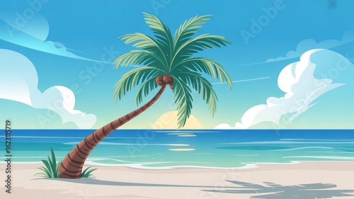 © ACE STEEL D, Obraz premium Serene Tropical Beach Scene with Single Palm Tree at Sunset