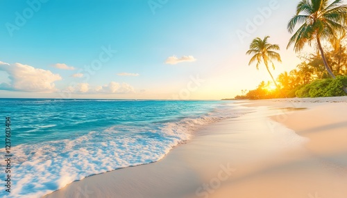 © Berkah, Fototapeta premium Serene Tropical Beach Sunset Scene With Palm Trees
