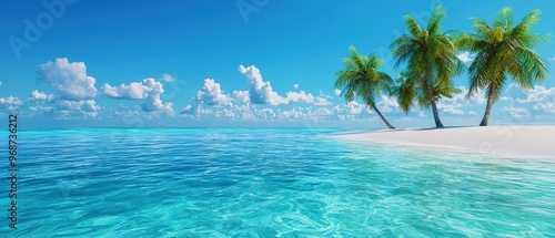 Fototapeta premium Serene tropical beach with clear blue waters, palm trees, and vibrant skies,...