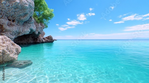 Fototapeta premium Serene tropical beach with clear turquoise water and rocky formations.
