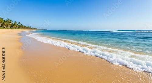 © Slamet, Obraz premium Serene Tropical Beach with Palm Trees and Gentle Waves Under a Clear Blue Sky