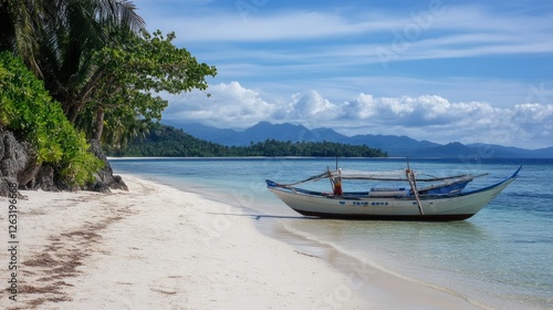 Obraz premium Serene Tropical Beachscape: Boat on Pristine White Sand
