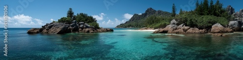 © Andrii Zastrozhnov, Fototapeta premium Serene tropical island scenery with crystal clear waters and lush greenery