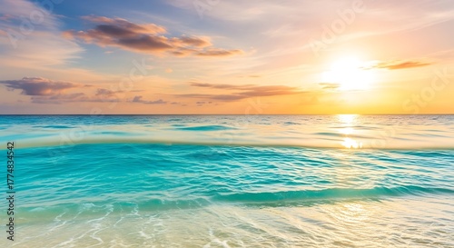 © Sadia, Obraz premium Serene tropical ocean sunset with golden sun and turquoise waves