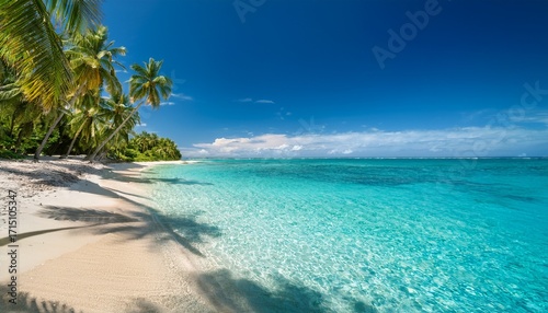 © Carly, Naklejka premium Serene Tropical Paradise Featuring An Exquisite Sandy Beach Surrounded By Vibrant Palm Trees And Crystal Clear Turquoise Waters