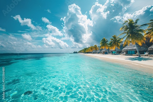Fototapeta premium Serene Tropical Paradise with Crystal Clear Waters and Lush Palm Trees