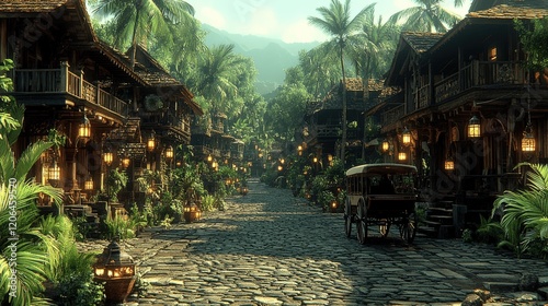 © Ross, Obraz premium Serene Tropical Village Street Lined with Wooden Houses and Palm Trees at Dusk Illuminated with Hanging Lanterns Creating a Peaceful Atmosphere for Visitors