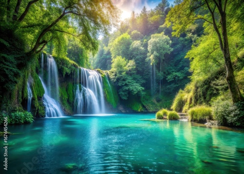 © SANAN, Obraz premium Serene turquoise lake surrounded by dense green forest with a waterfall cascading down into the water