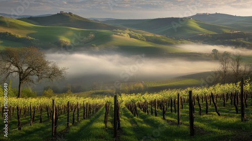 Naklejka premium Serene Tuscan Landscape at Sunrise with Mist and Vineyards