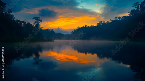 Fototapeta premium Serene twilight lake reflection, misty morning landscape with stunning sky colors