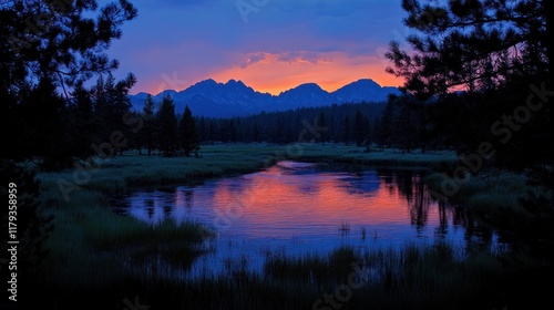 © aritha, Fototapeta premium Serene twilight landscape with mountains reflecting in a tranquil river.