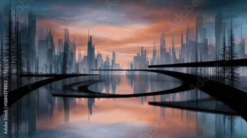 © Matthew, Fototapeta premium Serene twilight over a futuristic cityscape reflecting in a tranquil river with silhouetted trees