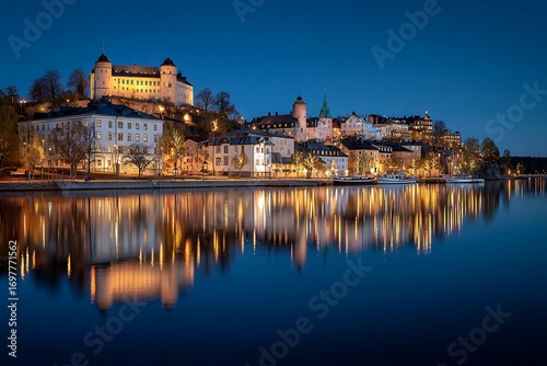 © Shahidul, Obraz premium Serene Twilight Panorama: Historic European Cityscape Reflected in Calm River Waters