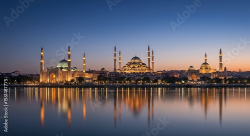 © hana, Fototapeta premium Serene twilight panorama of a city skyline featuring illuminated mosques and minarets