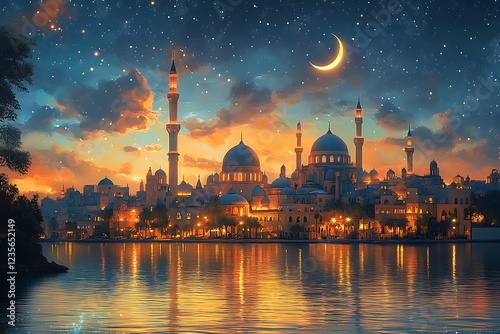 © Micro, Fototapeta premium Serene Twilight Scene of Mosque with Domes and Minarets Reflected on Water Under Starlit Sky and Crescent Moon