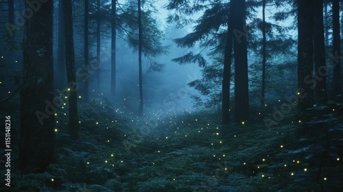 © Maetinee, Obraz premium Serene twilight viewpoint captivating glow of fireflies in enchanted forest clearing