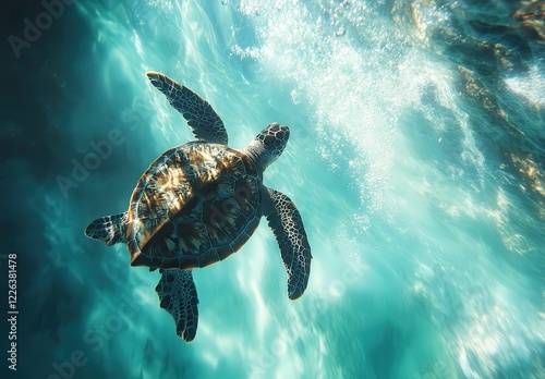 Fototapeta premium Serene Underwater Scene Featuring a Majestic Sea Turtle Gliding Gracefully Through Crystal Clear Ocean Waters with Sunlight Filtering Through Waves