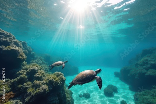 Fototapeta premium Serene Underwater Scene with Sea Turtles Swimming Through Crystal Clear Waters and Sunlight Rays