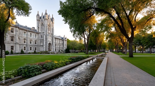 © RAKSIWAH, Obraz premium Serene University Campus Pathway Stone Building Fountain Autumn Trees