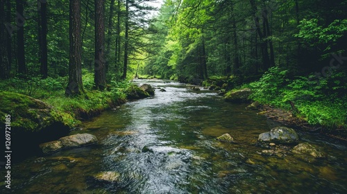 © Kitta Studio, Obraz premium Serene Untouched Natural Landscape of a Calm Forest River