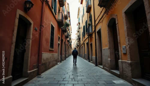 © Nathaphat, Fototapeta premium Serene Urban Alleyway Scene with Vibrant Building Colors and Solitary Figure Walking