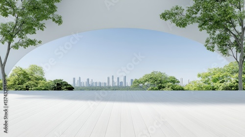Naklejka premium Serene Urban Oasis: Modern Architecture with City Skyline View
